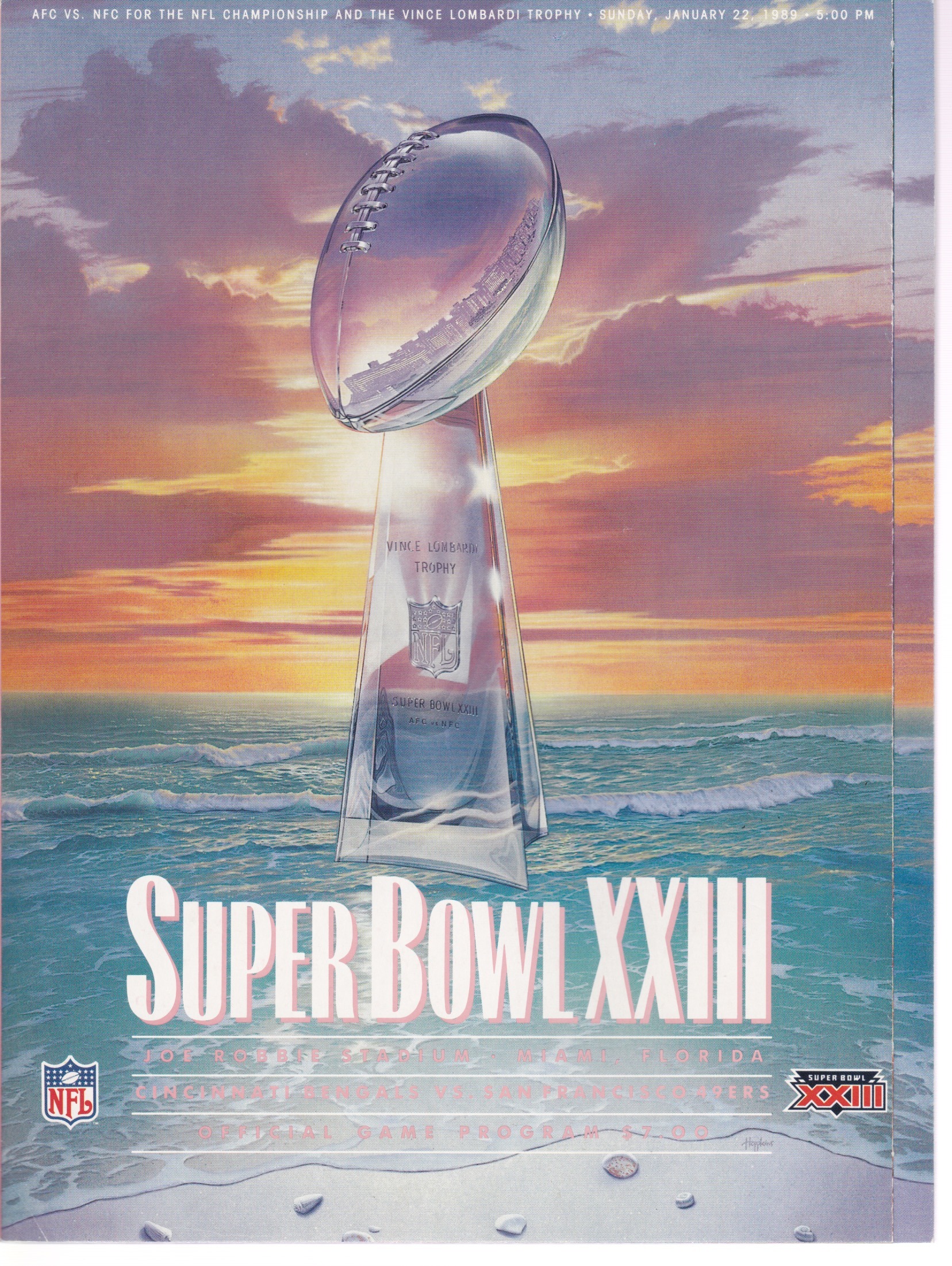 Books and Magazines (Brand: National Football League) (Type: Super Bowl XXIII Official Game Program) (Subtype: Joe Robbie Stadium, Miami FL, Jan 22, 1989) (Kind of Packaging: ) (Year: 1989) (Unique Number: n/a) (Numbered Item: ) (Feature: Cincinnati Bengals, San Francisco 49ers)