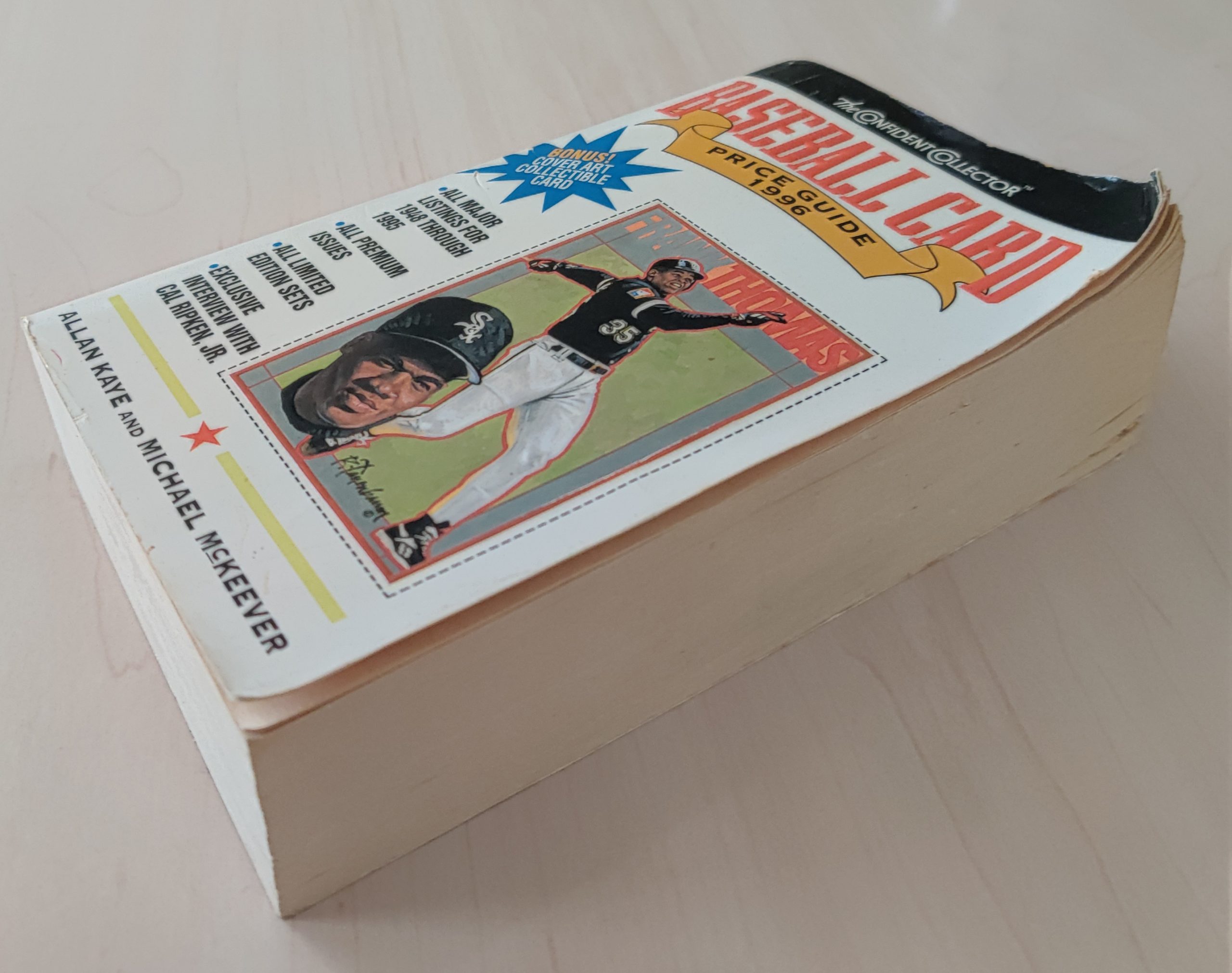 Baseball (Brand: Avon / Confident Collector) (Type: Price Guide, cover art collectible card, all major listings for 1948-1995, all premium issues, all limited edition sets, exclusive interview with Cal Ripken Jr. By Allan Kaye and Michael McKeever, ISBN 0-380-78201-4. Pages show crimps/curls.) (Subtype: NA) (Kind of Packaging: Book) (Year: 1996) (Unique Number: various) (Numbered Card: ) (Player:various))