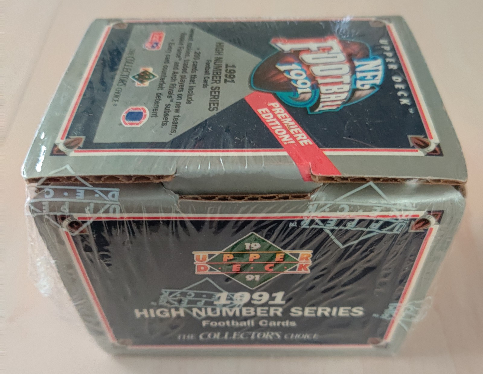 Football (Brand: Upper Deck Collector’s Choice) (Type: Complete Set High Number Series featuring 4-card subset “Number 1 Draft Pick of the ’90’s”, includes newest rookies, traded players on new teams, Rookie Force and Arch Rivals subsets, every card counterfeit deterrent.) (Subtype: 200 cards) (Kind of Packaging: Boxed Set) (Year: 1991) (Unique Number: Various) (Numbered Card: ) (Player: Various))