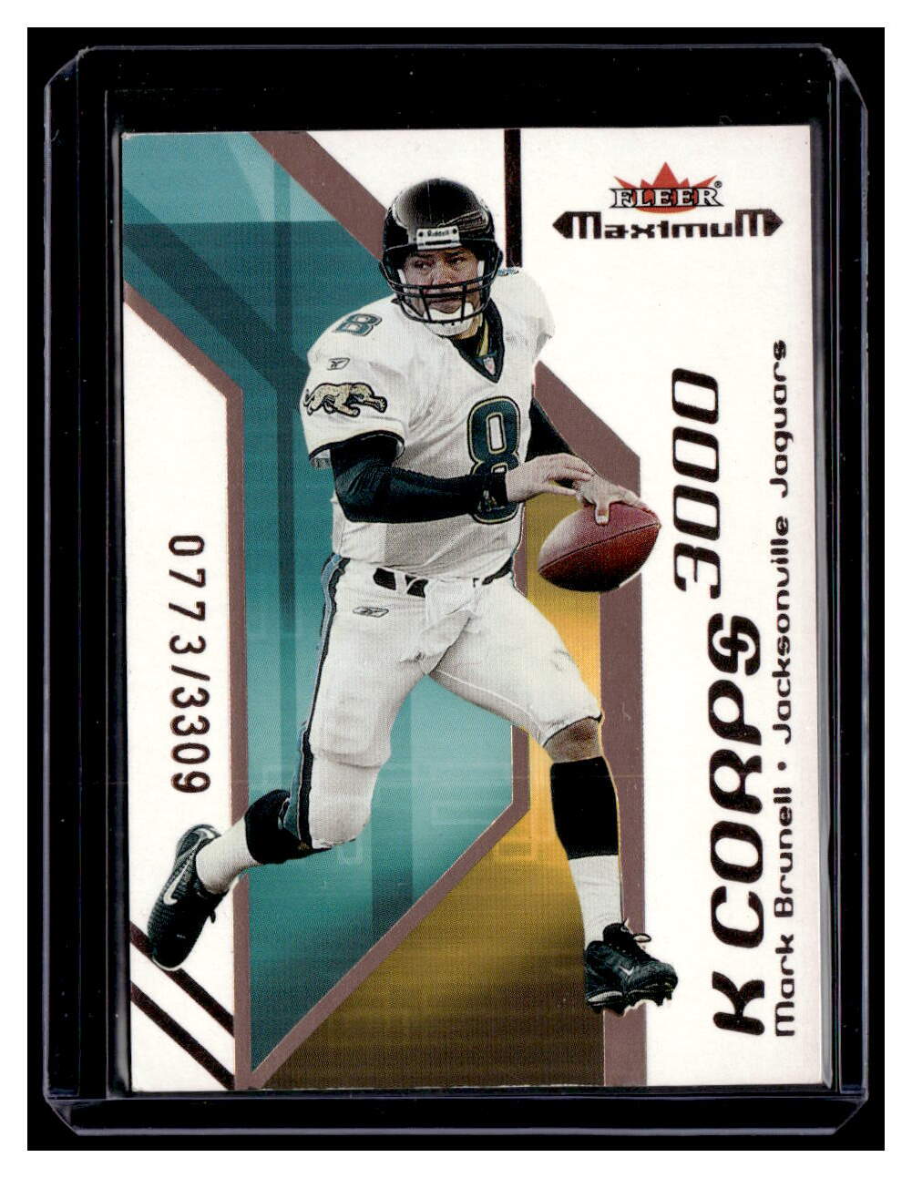 Football (Brand: Fleer/Skybox) (Type: Fleer Maximum) (Subtype: K Corps 3000) (Hall of Famer: ) (Superstar: ) (Rookie: ) (Kind of Packaging: Toploader with Sleeve) (Year: 2002) (Unique Number: 13 of 58 KC) (Numbered Card: 0773/3309) (Player:Mark Brunell) quantity
