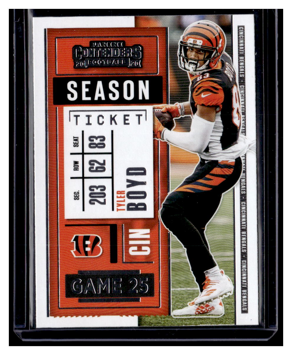 Football (Brand: Panini) (Type: 2020 Contenders) (Subtype: Season Ticket, Game 25) (Hall of Famer: ) (Superstar: ) (Rookie: ) (Kind of Packaging: Toploader with Sleeve) (Year: 2020) (Unique Number: 86) (Numbered Card: ) (Player:Tyler Boyd)