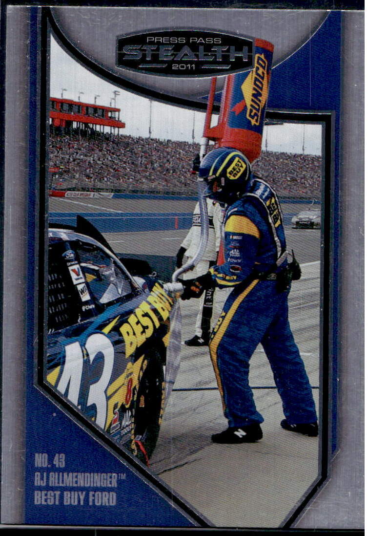 NASCAR (Brand: Press Pass) (Type: Stealth 2011) (Subtype: Refueling Mission) (Kind of Packaging: Semi-Rigid with Sleeve) (Year: 2011) (Unique Number: 96) (Numbered Card: ) (Driver: No. 43 RJ Allmendinger Best Buy Ford))