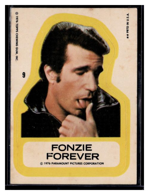 Entertainment (Brand: Topps Chewing Gum) (Type: Fonzie Forever) (Subtype: Sticker Card) (Hall of Famer: ) (Superstar: ) (Rookie: ) (Kind of Packaging: Semi-Rigid with Sleeve) (Year: 1976) (Unique Number: 9) (Numbered Card: ) (Feature: Arthur “The Fonz” Fonzarelli)