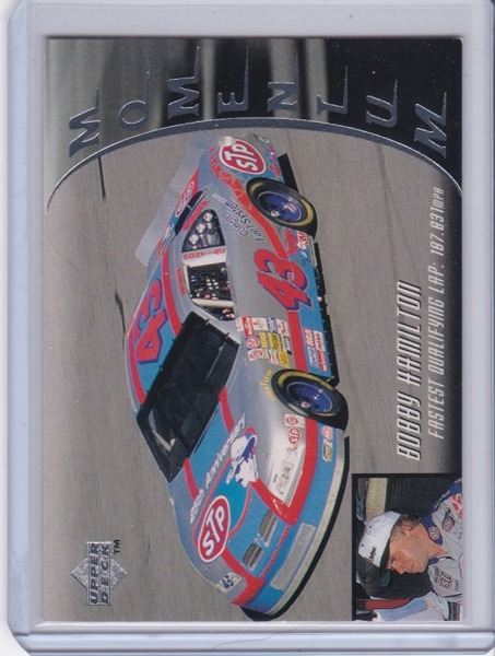 NASCAR (Brand: Upper Deck) (Type: Momentum) (Subtype: Fastest Qualifying Lap) (Kind of Packaging: Toploader) (Year: 1996) (Unique Number: 64) (Numbered Card: ) (Feature: Bobby Hamilton)