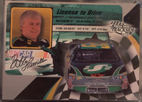 NASCAR (Brand: Press Pass) (Type: Trackside 2002, signature) (Subtype: License to Drive) (Kind of Packaging: One-Touch) (Year: 2002) (Unique Number: NA) (Numbered Card: LD 12/36) (Feature: Bobby Hamilton) (Sleeve: No)