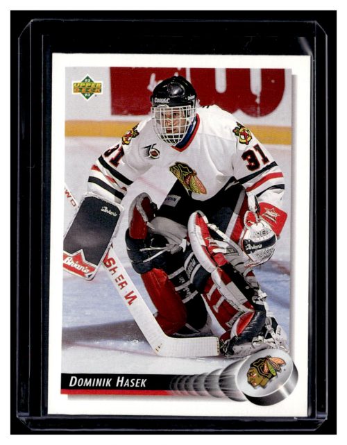 Hockey (Brand: Upper Deck) (Type: Upper Deck 92 93) (Subtype: ) (Hall of Famer: ) (Superstar: ) (Rookie: ) (Kind of Packaging: Toploader with Sleeve) (Year: 1992) (Unique Number: 92) (Numbered Card: ) (Player: Dominik Hasek)