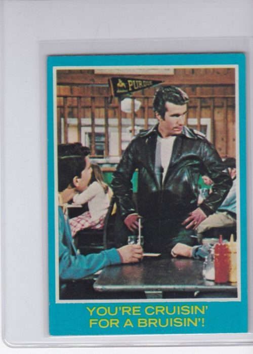 Entertainment (Brand: Topps Chewing Gum) (Type: You’re Crusin’ for a Bruisin’!) (Subtype: Part of a 44 Card Collection) (Kind of Packaging: Semi-Rigid with Sleeve) (Year: 1976) (Unique Number: 21) (Numbered Card: ) (Feature: Happy Days)