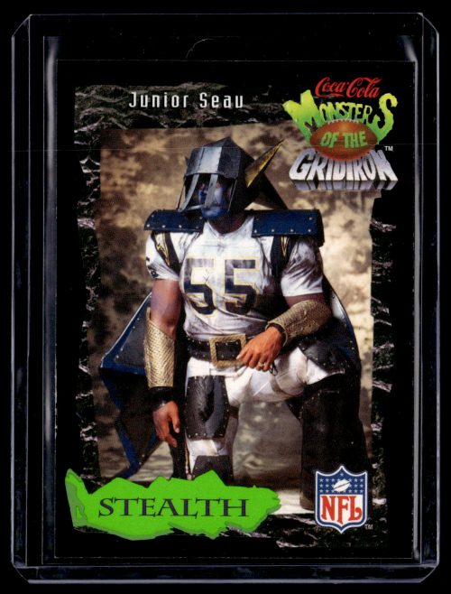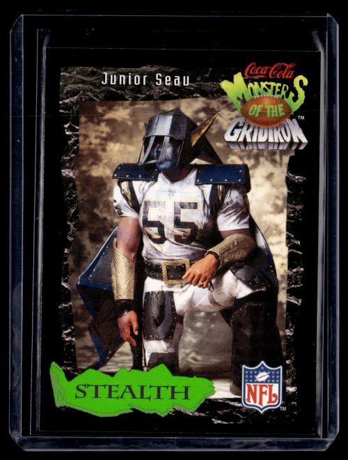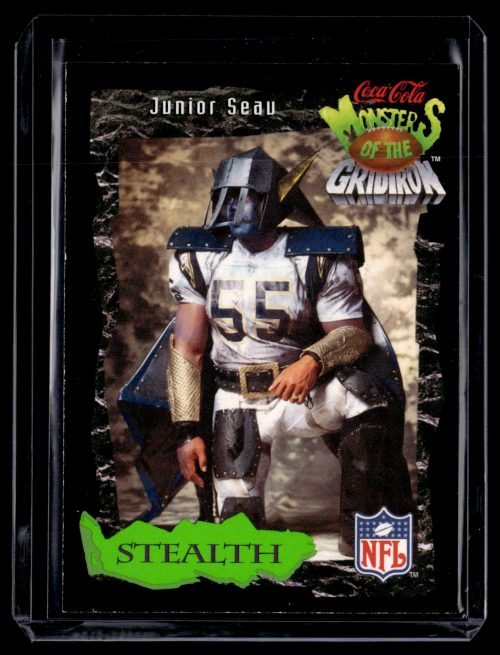 Football (Brand: Classic Pro-Line Live) (Type: Coca-Cola Monsters of the Gridiron) (Subtype: Stealth) (Hall of Famer: Y) (Superstar: ) (Rookie: ) (Kind of Packaging: Semi-Rigid with Sleeve) (Year: 1994) (Unique Number: 26 of 30) (Numbered Card: ) (Player: Junior Seau)
