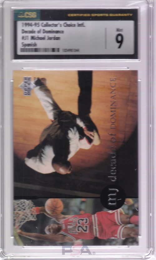 Basketball (Brand: Upper Deck) (Type: 1994-95 Collector’s Choice Intl.) (Subtype: Decade of Dominance, Spanish) (Kind of Packaging: Graded Slabbed) (Year: 1994) (Unique Number: J1) (Grade: Mint 9) (Feature: Michael Jordan)
