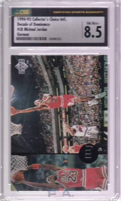 Basketball (Brand: Upper Deck) (Type: 1994-95 Collector’s Choice Intl.) (Subtype: Decade of Dominance, German) (Kind of Packaging: Graded Slabbed) (Year: 1994) (Unique Number: J6) (Grade: NM/Mint+ 8.5) (Feature: Michael Jordan)
