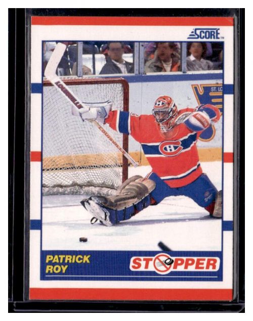 Hockey (Brand: Score) (Type: Stopper) (Subtype: The Puck Stops Here!) (Hall of Famer: ) (Superstar: ) (Rookie: ) (Kind of Packaging: Toploader with Sleeve) (Year: 1990) (Unique Number: 344) (Numbered Card: ) (Player: Patrick Roy)