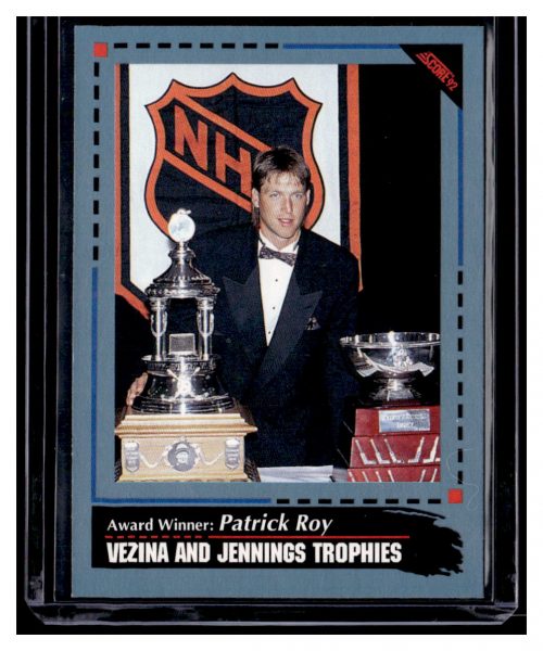 Hockey (Brand: Score) (Type: Vezina and Jennings Trophies) (Subtype: Award Winner) (Hall of Famer: ) (Superstar: ) (Rookie: ) (Kind of Packaging: Toploader with Sleeve) (Year: 1992) (Unique Number: 527) (Numbered Card: ) (Player: Patrick Roy)