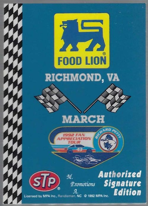 NASCAR (Brand: MPA Inc.) (Type: Food Lion) (Subtype: Richmond March 1992 Fan Appreciation Tour) (Kind of Packaging: Semi-Rigid with Sleeve) (Year: 1992) (Unique Number: 12) (Numbered Card: ) (Driver: Richard Petty))