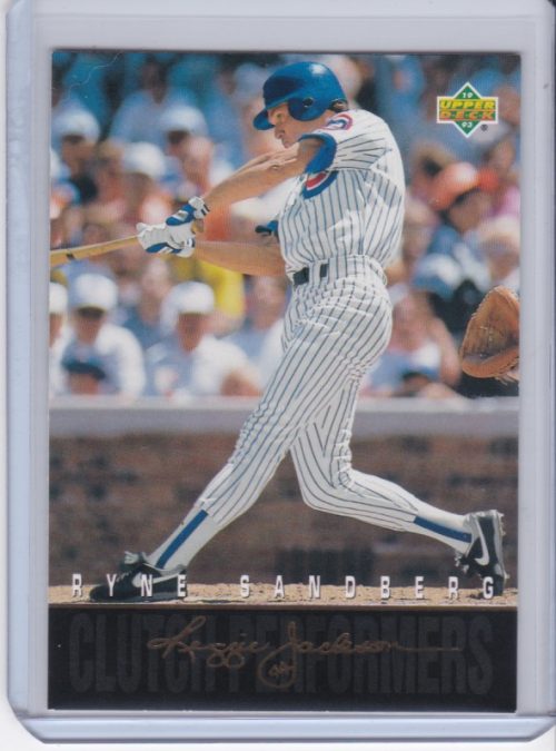 Baseball (Brand: Upper Deck) (Type: Upper Deck 1993) (Subtype: Facsimilie signature of Reggie Jackson) (Hall of Famer: ) (Superstar: ) (Rookie: ) (Kind of Packaging: Semi-Rigid with Sleeve) (Year: 1993) (Unique Number: R18) (Numbered Card: ) (Player:Ryne Sandberg)