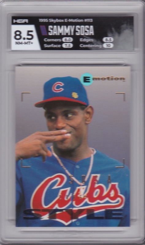 Graded Baseball Cards (Type: 1995 Skybox E-Motion) (Subtype: Style) (Copyright Year: 1996) (Grading Co.: HGA) (Grade: 8.5 NM-MT+) (Unique Number: 113) (Numbered Card: ) (Player: Sammy Sosa)