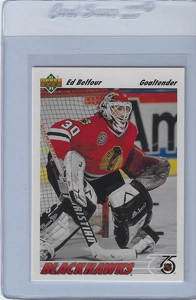Hockey Card (Player: Ed Belfour) (Brand: Upper Deck) (Type: ) (Hall of Fame: Yes) (Superstar: No) (Rookie: No) (Kind of Packaging: Semi-Rigid) (Sleeve: Yes) (Unique Number: 164) (Year: 1991)