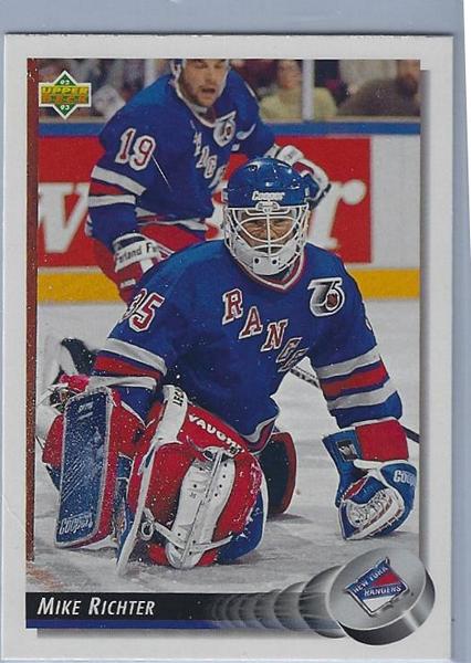 Hockey Card (Player: Mike Richter) (Brand: Upper Deck) (Type: ) (Hall of Fame: Yes) (Superstar: No) (Rookie: No) (Kind of Packaging: Semi-Rigid) (Sleeve: Yes) (Unique Number: 145) (Year: 1992)