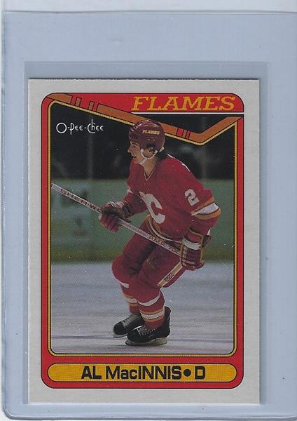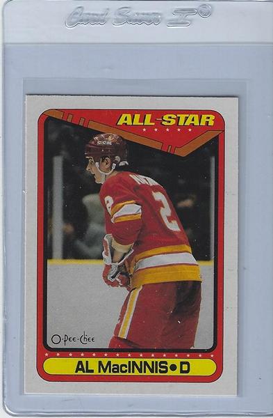 Hockey Card (Player: Al MacInnis) (Brand: O-Pee-Chee) (Type: All-Star) (Hall of Fame: Yes) (Superstar: No) (Rookie: No) (Kind of Packaging: Semi-Rigid) (Sleeve: Yes) (Unique Number: 197) (Year: 1990)