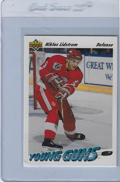 Hockey Card (Player: Niklas Lidstrom) (Brand: Upper Deck) (Type: Young Guns) (Hall of Fame: Yes) (Superstar: No) (Rookie: No) (Kind of Packaging: Semi-Rigid) (Sleeve: Yes) (Unique Number: 587) (Year: 1992)