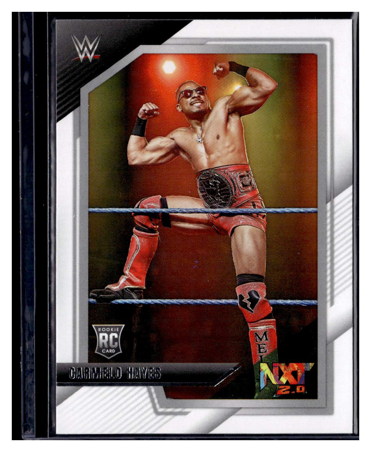 Wrestling (Brand: Panini) (Type: NXT WWE) (Subtype: RC Rookie Card) (Hall of Famer: ) (Superstar: ) (Rookie: Y) (Kind of Packaging: Toploader with Sleeve) (Year: 2022) (Unique Number: 55) (Numbered Card: ) (Feature: Carmelo Hayes)
