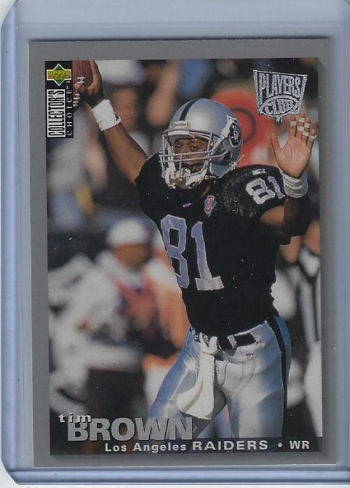 Football (Brand: Upper Deck) (Type: Collector’s Choice) (Subtype: Player’s Club) (Hall of Famer: Y) (Superstar: N) (Rookie: N) (Kind of Packaging: Top Loader with Sleeve) (Year: 1995) (Unique Number: 62) (Numbered Card: ) (Player:Tim Brown)