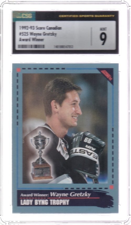 Hockey (Brand: Score) (Type: 1992-93 Score Canadian) (Subtype: Lady Byng Trophy Award Winner) (Kind of Packaging: Graded Slabbed) (Year: 1992) (Unique Number: 525) (Grade: Mint 9) (Feature: Wayne Gretzky)