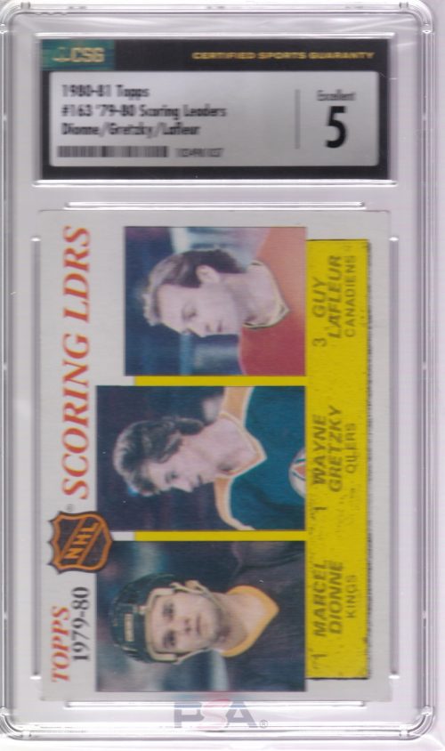 Hockey (Brand: Topps Chewing Gum) (Type: 1980-81) (Subtype: 79-80 Scoring Leaders) (Kind of Packaging: Graded Slabbed) (Year: 1980) (Unique Number: 163) (Grade: Excellent 5) (Feature: Marcel Dionne, Wayne Gretzky, Guy Lafleur)
