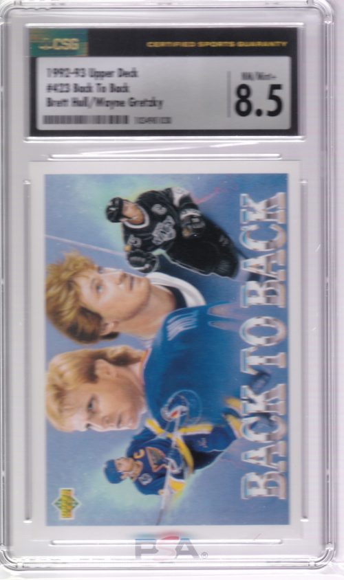 Hockey (Brand: Upper Deck) (Type: 1992-93) (Subtype: Back to Back) (Kind of Packaging: Graded Slabbed) (Year: 1992) (Unique Number: 423) (Grade: NM/Mint+ 8.5) (Feature: Brett Hull, Wayne Gretzky)