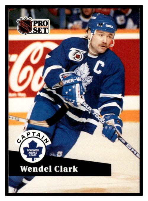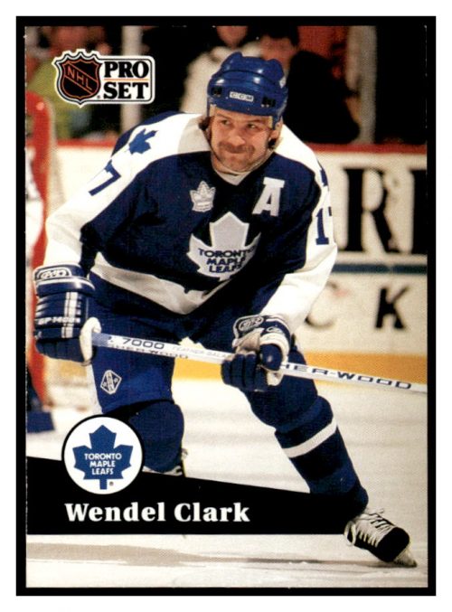 Hockey (Brand: Pro Set) (Type: NHL Pro Set) (Subtype: Captain) (Hall of Famer: ) (Superstar: ) (Rookie: ) (Kind of Packaging: Semi-Rigid with Sleeve) (Year: 1991) (Unique Number: 585) (Numbered Card: ) (Player: Wendel Clark)