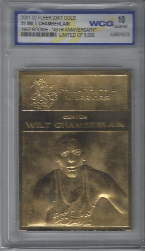 Graded Basketball Cards (Brand: Fleer) (Type: 23kt Gold 1962 Rookie 40th Anniversary Limited of 5,000) (Subtype: NA) (Kind of Packaging: Graded) (Grading Company: WCG) (Grade: GEM-MT 10) (HALL OF FAME: NA)(SUPERSTAR: NA) (ROOKIE: NA) (Year: 2001-02) (Unique Number: Serial Number 2859) (Numbered Card: NA) (Player: Wilt Chamberlain)