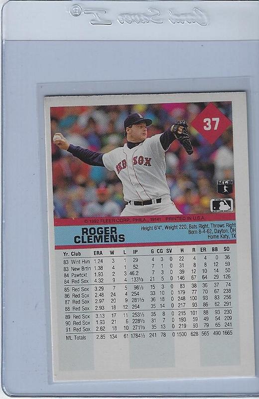 Baseball (Brand: Fleer) (Type: Fleer ’92) (Subtype: ) (Hall of Famer: N) (Superstar: Y) (Rookie: N) (Kind of Packaging: Semi-Rigid with Sleeve) (Year: 1992) (Unique Number: 37) (Numbered Card: ) (Player:Roger Clemens)