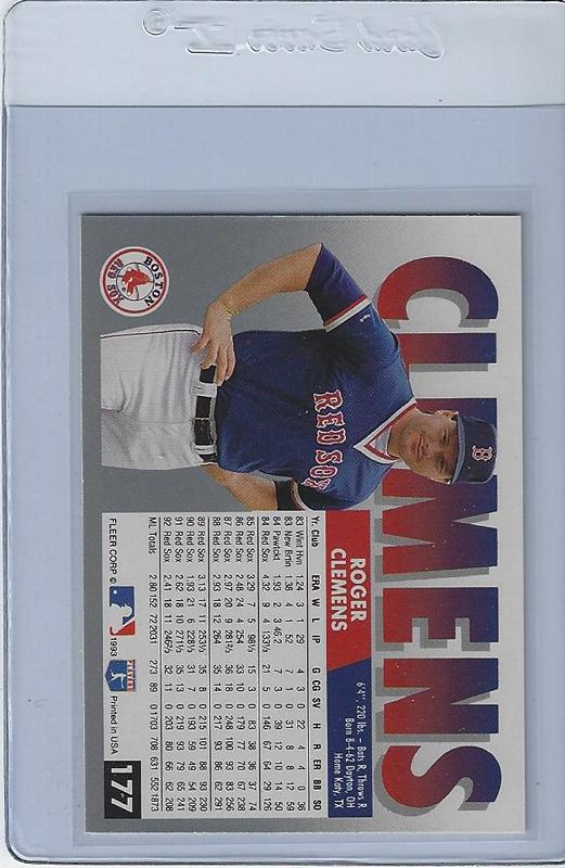 Baseball (Brand: Fleer) (Type: Fleer ’93) (Subtype: ) (Hall of Famer: N) (Superstar: Y) (Rookie: N) (Kind of Packaging: Semi-Rigid with Sleeve) (Year: 1993) (Unique Number: 177) (Numbered Card: ) (Player:Roger Clemens)