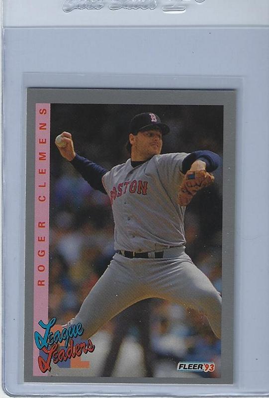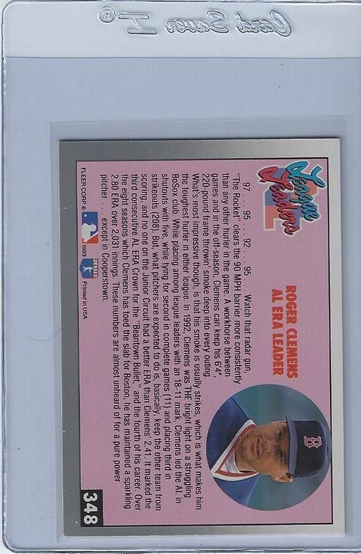 Baseball (Brand: Fleer) (Type: Fleer ’93) (Subtype: League Leaders) (Hall of Famer: N) (Superstar: Y) (Rookie: N) (Kind of Packaging: Semi-Rigid with Sleeve) (Year: 1993) (Unique Number: 348) (Numbered Card: ) (Player:Roger Clemens)