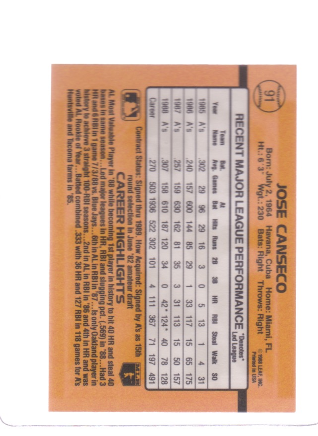Baseball (Brand: Leaf) (Type: Donruss 90) (Subtype: ) (Kind of Packaging: Semi-Rigid) (Year: 1988) (Unique Number: 91) (Player: Jose Canseco)