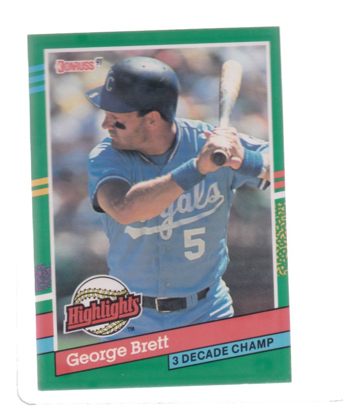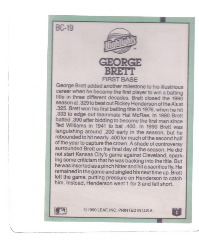 Baseball (Brand: Leaf) (Type: Donruss 91) (Subtype: Highlights, 3 Decade Champ) (Kind of Packaging: Semi-Rigid with Sleeve) (Year: 1990) (Unique Number: BC-19) (Player:George Brett)