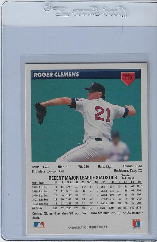 Baseball (Brand: Leaf) (Type: Donruss) (Subtype: ) (Hall of Famer: N) (Superstar: Y) (Rookie: N) (Kind of Packaging: Semi-Rigid with Sleeve) (Year: 1992) (Unique Number: 119) (Numbered Card: ) (Player:Roger Clemens)