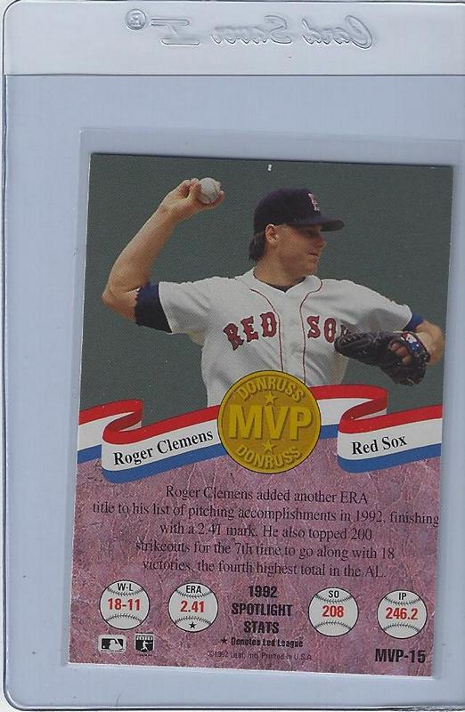 Baseball (Brand: Leaf) (Type: Donruss) (Subtype: ) (Hall of Famer: N) (Superstar: Y) (Rookie: N) (Kind of Packaging: Semi-Rigid with Sleeve) (Year: 1992) (Unique Number: MVP-15) (Numbered Card: ) (Player:Roger Clemens)