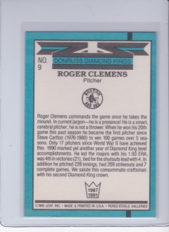 Baseball (Brand: Leaf) (Type: Doruss) (Subtype: Diamond Kings) (Kind of Packaging: Semi-Rigid) (Year: 1990) (Unique Number: 9) (Player: Roger Clemens)