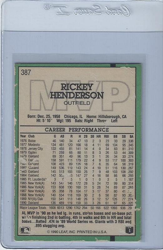 Baseball (Brand: Leaf) (Type: MVP) (Subtype: ) (Hall of Famer: Y) (Superstar: N) (Rookie: N) (Kind of Packaging: Semi-Rigid with Sleeve) (Year: 1990) (Unique Number: 387) (Numbered Card: ) (Player:Rickey Henderson)