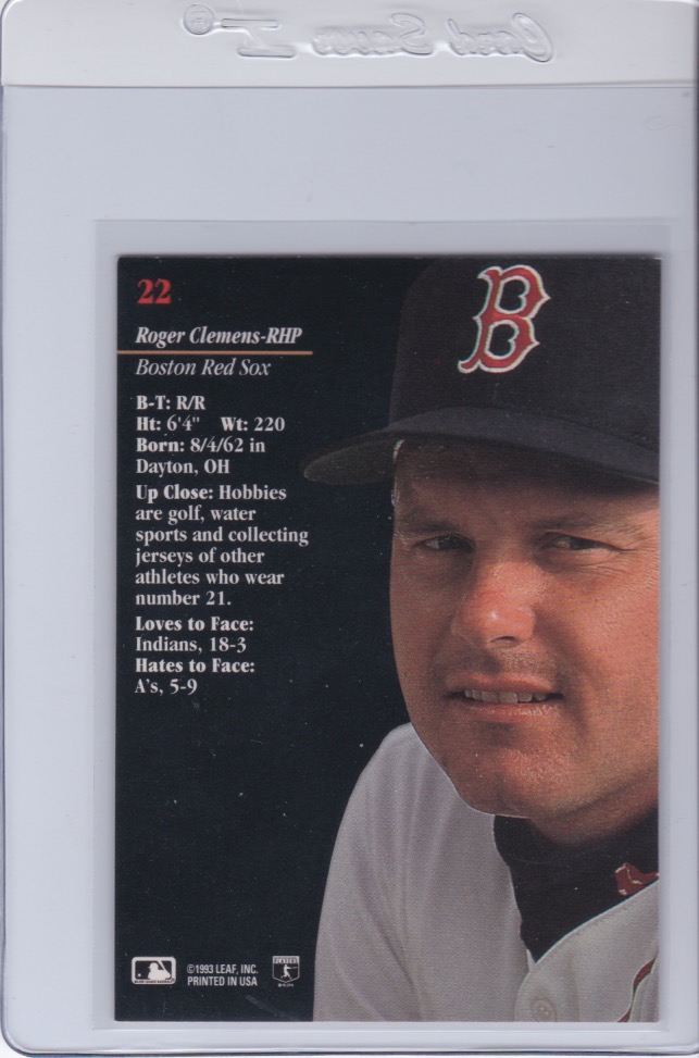 Baseball (Brand: Leaf) (Type: Studio) (Subtype: signed) (Hall of Famer: N) (Superstar: Y) (Rookie: N) (Kind of Packaging: Semi-Rigid with Sleeve) (Year: 1993) (Unique Number: 22) (Numbered Card: ) (Player:Roger Clemens)