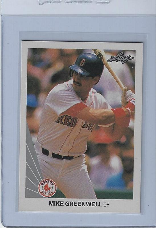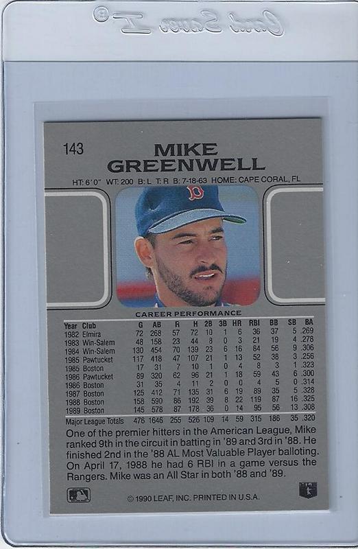 Baseball (Brand: Leaf) (Type: ) (Subtype: ) (Hall of Famer: N) (Superstar: Y) (Rookie: N) (Kind of Packaging: Semi-Rigid with Sleeve) (Year: 1990) (Unique Number: 143) (Numbered Card: ) (Player:Mike Greenwell)