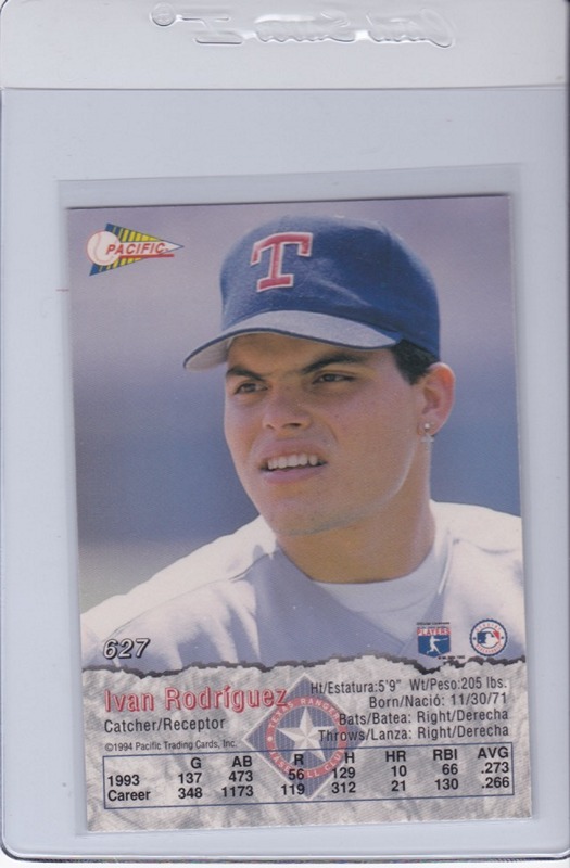 Baseball (Brand: Pacific) (Type: Crown Collection) (Subtype: ) (Hall of Famer: Y) (Superstar: N) (Rookie: N) (Kind of Packaging: Semi-Rigid with Sleeve) (Year: 1994) (Unique Number: 627) (Numbered Card: ) (Player:Ivan Rodriguez)