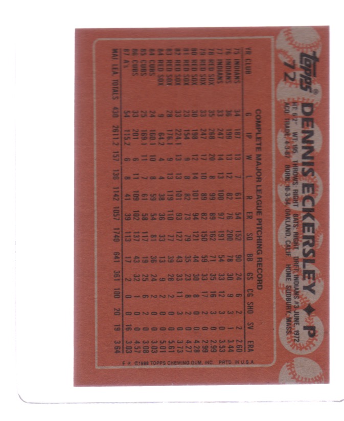 Baseball (Brand: Topps Chewing Gum) (Type: ) (Subtype: ) (Kind of Packaging: ) (Year: 1988) (Unique Number: 72) (Player:Dennis Eckersley)