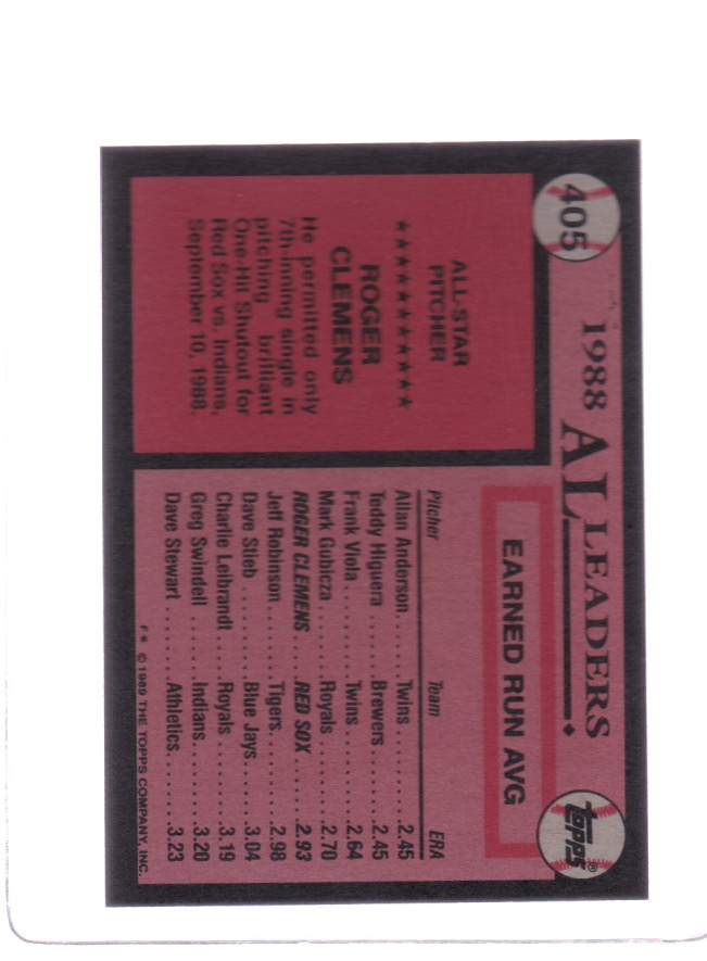 Baseball (Brand: Topps) (Type: All Star, American League) (Subtype: 1988 AL Leaders) (Kind of Packaging: Semi-Rigid with Sleeve) (Year: 1989) (Unique Number: 405) (Player:Roger Clemens)