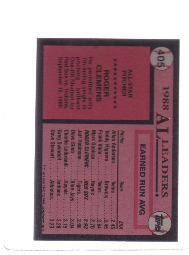 Baseball (Brand: Topps) (Type: All Star, American League) (Subtype: 1989 AL Leaders) (Kind of Packaging: Semi-Rigid) (Year: 1989) (Unique Number: 405) (Player: Roger Clemens)