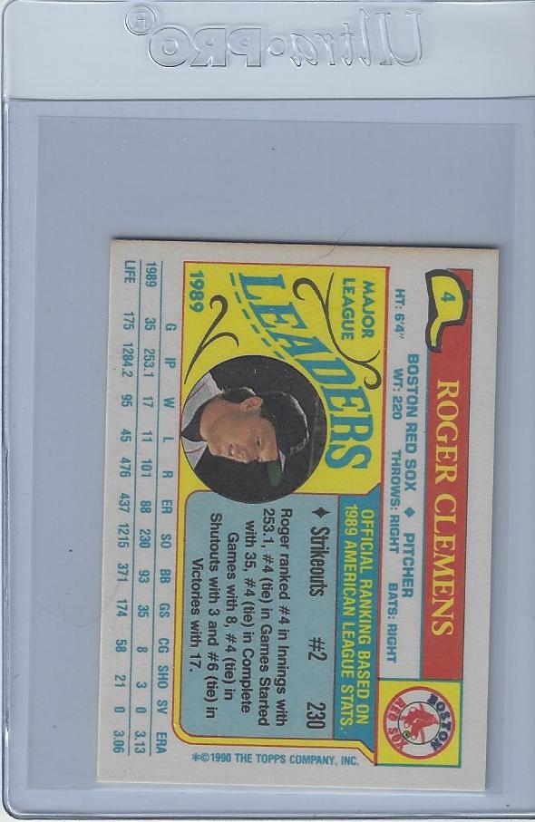 Baseball (Brand: Topps) (Type: ) (Subtype: ) (Hall of Famer: N) (Superstar: Y) (Rookie: N) (Kind of Packaging: Semi-Rigid with Sleeve) (Year: 1990) (Unique Number: 4) (Numbered Card: ) (Player:Roger Clemens)