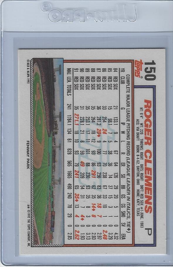 Baseball (Brand: Topps) (Type: ) (Subtype: ) (Hall of Famer: N) (Superstar: Y) (Rookie: N) (Kind of Packaging: Semi-Rigid with Sleeve) (Year: 1992) (Unique Number: 150) (Numbered Card: ) (Player:Roger Clemens)