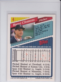 Baseball (Brand: Topps) (Type: ) (Subtype: ) (Hall of Famer: ) (Superstar: ) (Rookie: ) (Kind of Packaging: Semi-Rigid with Sleeve) (Year: 1993) (Unique Number: 4) (Numbered Card: ) (Player:Roger Clemens)