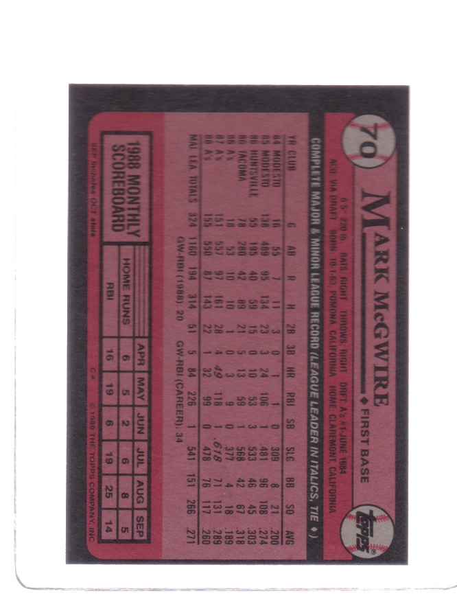 Baseball (Brand: Topps) (Type: ) (Subtype: ) (Kind of Packaging: Semi-Rigid with Sleeve) (Year: 1989) (Unique Number: 70) (Player:Mark McGwire)