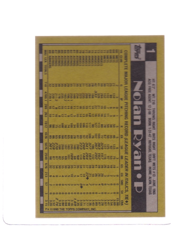 Baseball (Brand: Topps) (Type: ) (Subtype: ) (Kind of Packaging: Semi-Rigid) (Year: 1990) (Unique Number: 1) (Player: Nolan Ryan)